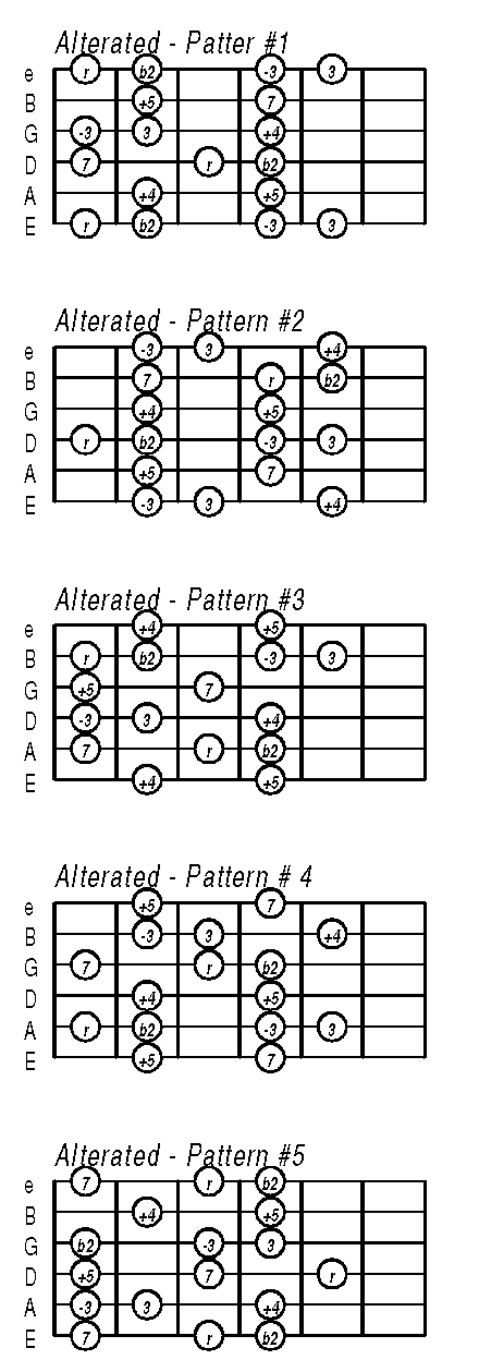 The alterated scale is usually played over dominant 7th chords. It doesn’t have a clean 5th, though, but the notes of the scale fit perfectly as “higher chord options”. That means, the b2 can be interpreted as a b9, the –3 can be interpreted as a #9, the +4 as a #11 and the +5 as a b13. These are the chord options that work for chords that are really used as dominant 7th chords (not necassarily all chords of a blues, since those are blues chaords and don’t have the function of dominant 7th chords