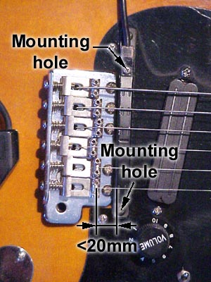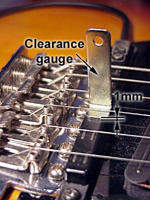 The distance beween the point where the guitar strings touch the bridge and the devided pickup shouldn't be more than 20mm (13/16"). The optimal distance for heavy gauge strings is 15mm (9/16"). It should be possible to adjust the heigth so that the clearance between the pickup system and the strings is about 1mm. There is a clearance gauge included in the mounting kit for the GK-2A.