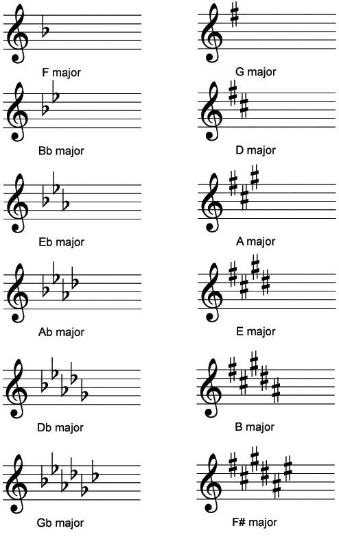 Here only the Ionian major scales are shown. The accidentals for the corresponding minor scales are the same. E.g. accidentals for (Aeolian) G minor are the same like Bb major. The accidentals for C major are not shown, since there are none.