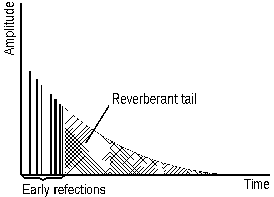 The first thing to be heard is the direct sound of the sound source. After that the early reflections occure. That is a cluster of direct reflections from the closest walls. Since the sound is reflected over and over again a so called reverberant tail occures at the end of the reverb sound. Here the reflections are too close, so that you can't distinguish between the reflections.