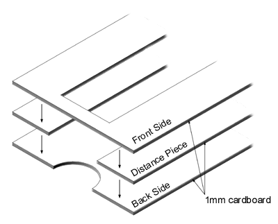 Let the glue dry for some minutes before you cut out the parts. Now you have the front, the back, two distance pieces for the sides and the slide. Don't forget to cut out the inner part of the front. A cutting knife is really helpful for that. |