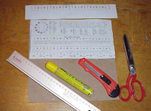 That are the tools: A pair of scissors, a cutting knife (may be useful), some glue and a ruler. A bottle might be helpful too. You can roll it over the parts you have glued together to apply some pressure. Cut off the strip at the bottom of the page (back side of the slide) and glue the rest of the paper onto some cardboard. |